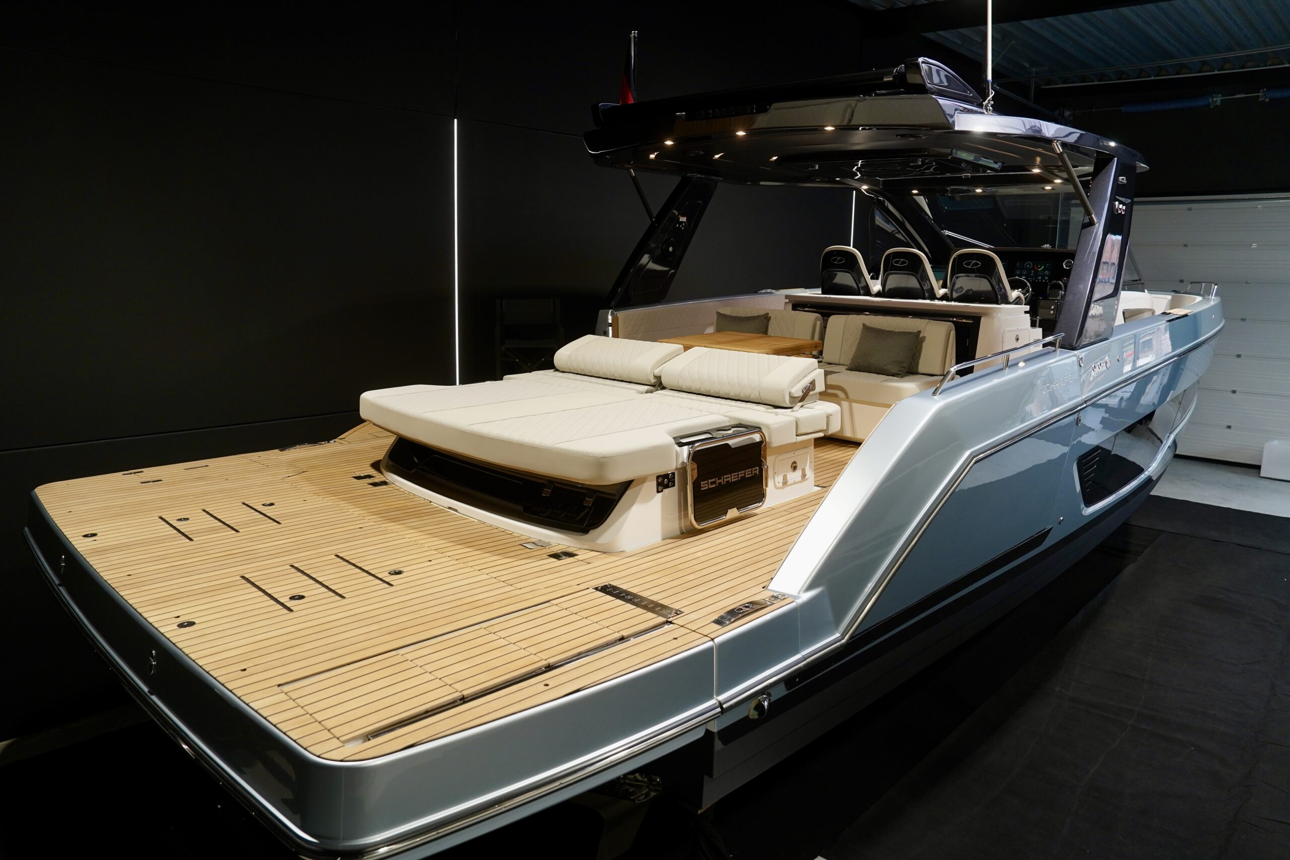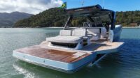Option complète Silver metallic Beauty. C'est le bateau de plaisance idéal, équipé de tout ce dont vous avez besoin. Avec ses balcons ouverts de plus de 6 mètres de large, un seul escalier sur toute la surface, un sol entièrement recouvert de teck et équipé d'une grande plateforme de baignade hydraulique et d'un escalier automatique dépliable. La cabine est très lumineuse et peut accueillir 4 personnes pour la nuit